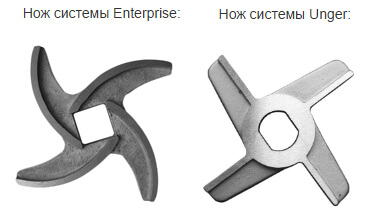 Мясорубка для профессиональной кухни сильно отличается от привычных бытовых моделей. Агрегат мощный, высокопроизводительный, способный перерабатывать десятки килограммов мясопродуктов в течение смены. Каждая профессиональная машина комплектуется системой ножей, которая состоит из нескольких лезвий. Вариантов комплектации два: Enterprise с квадратным посадочным отверстием и Unger, форма отверстия, в котором имеются скругленные края, приближена к овальной. Системы Unger делятся на полуунгер и полный унгер.